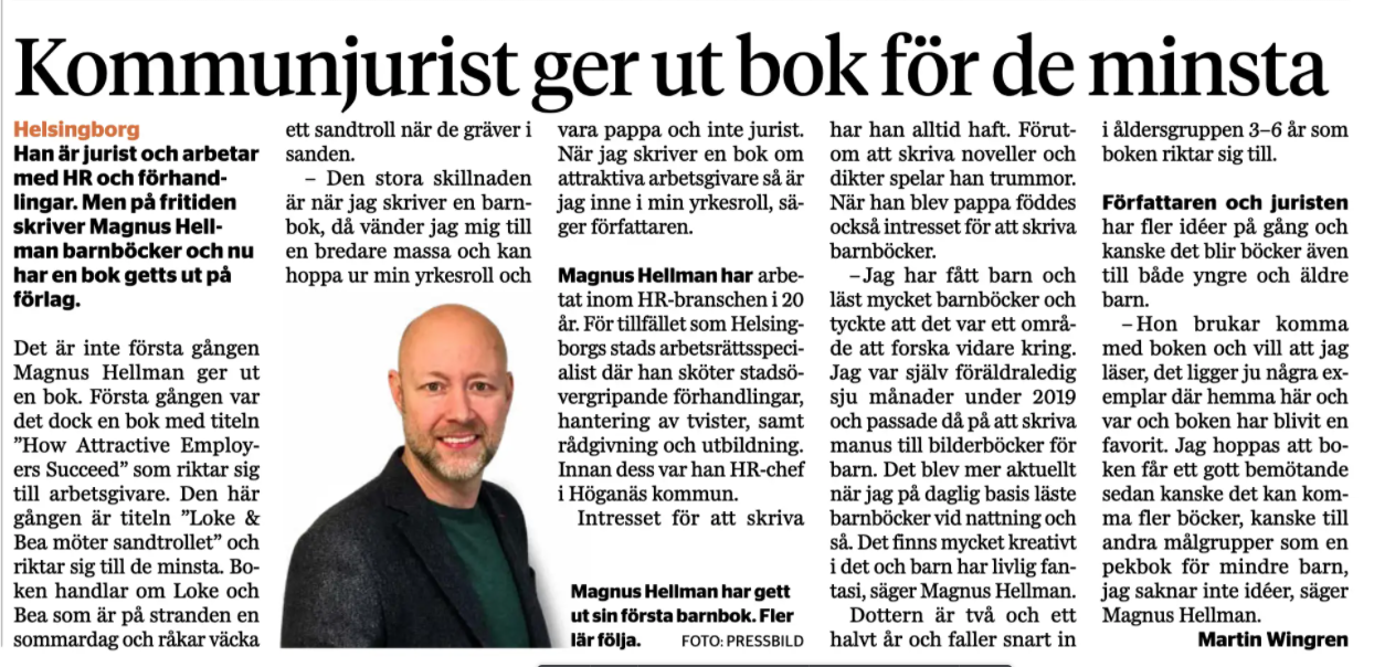 In Helsingborgs Dagblad and in Lokaltidningen Helsingborg there is an interview with the author. Follow the link: https://www.hd.se/2021-03-15/kommunjurist-ger-ut-barnbok-om-sandtroll